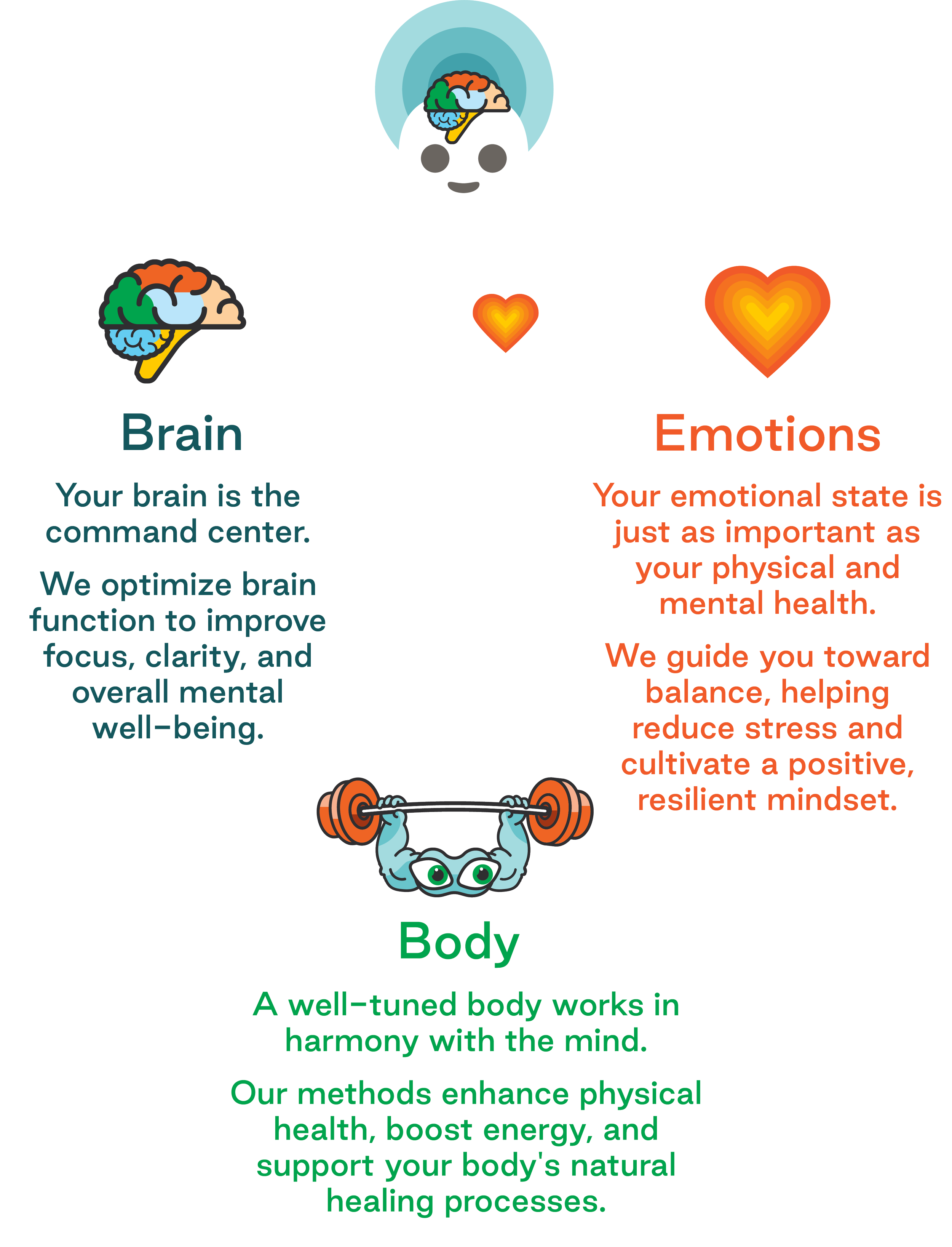 We use gentle and powerful techniques, combining leading-edge neuroscience and ancient energy principles to help your brain and body work together. Think of it as a massage for your brain and nervous system. Using gentle movements of your body to improve mobility and balance, breathwork to boost circulation, and simple, non-invasive techniques to reset your brain pathways and sensory systems (sight, sound, touch, taste, and smell), we help your nervous system function at its best—so you can feel your best.